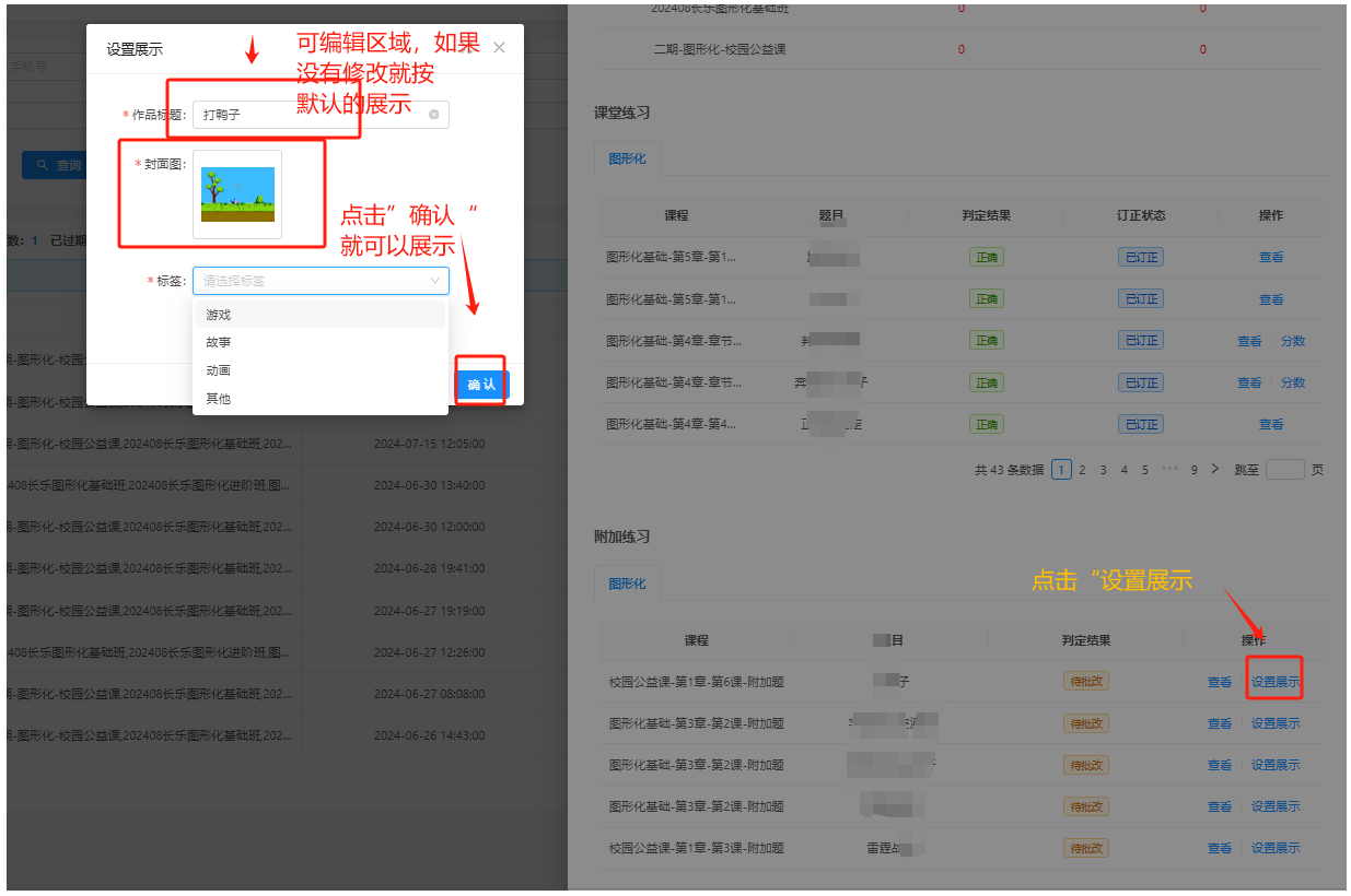 7、在班级学生列表中,点击 “作业” 按钮,你可以查看学生的作业记录,包括课堂练习和附加练习的完成情况、判定结果和订正状态等内容,如果是图形化或者Python班级中,你觉得某个学生附加作拼需要展示和分享给大家看可以点击“设为展示”,展示完可以在:课程学习-作品展示查看中位置查看,也可以在:作品展示管理-作品管理中设置上/下架等功能,根据自己的需求决定。