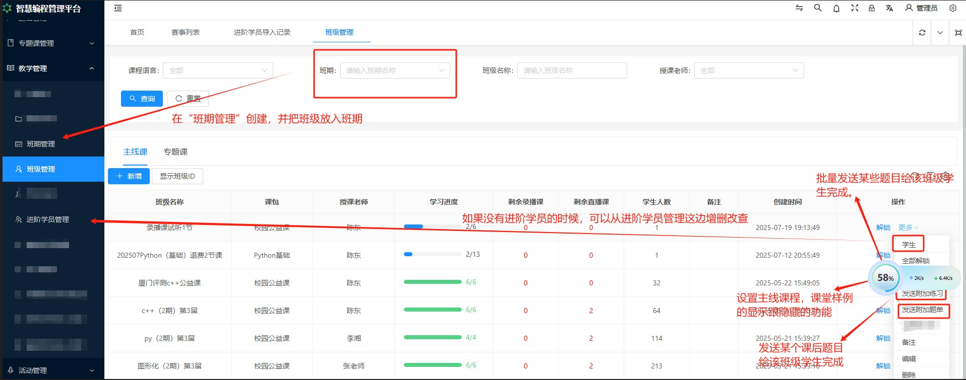 1、班级新增:点击 “新增” 按钮,你可以创建新的主线课班级。在新增班级页面,你需要输入班级名称、选择课包、授课老师等信息。