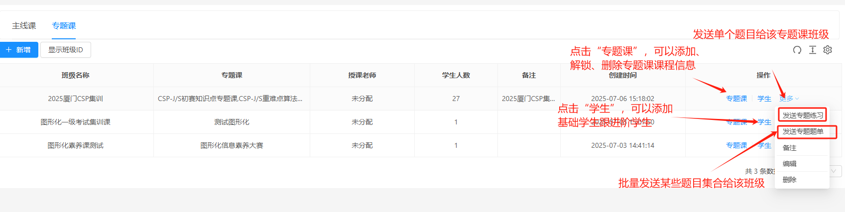1、班级新增:点击 “新增” 按钮,你可以创建新的专题课班级。在新增班级页面,你需要输入班级名称、选择专题课、授课老师等信息。