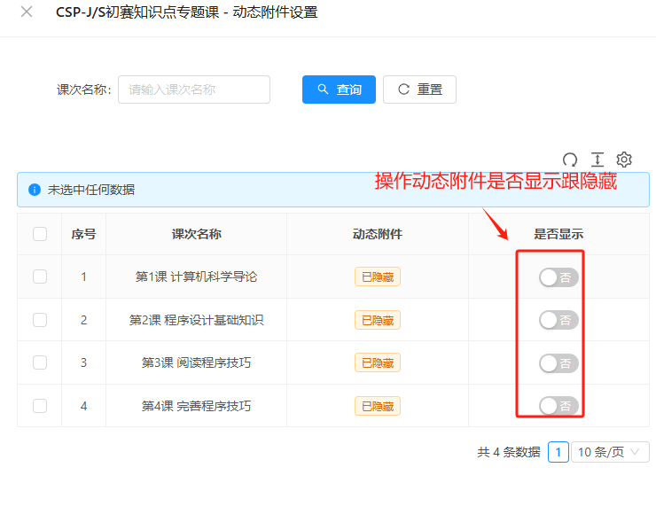 在班级管理中,你可以对专题课的动态附件进行设置。点击 “动态附件设置” 按钮,你可以设置课次的动态附件是否显示。在动态附件设置页面,你可以通过课次名称进行搜索,选择相应的课次,然后设置动态附件的显示状态。