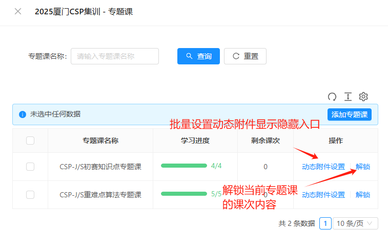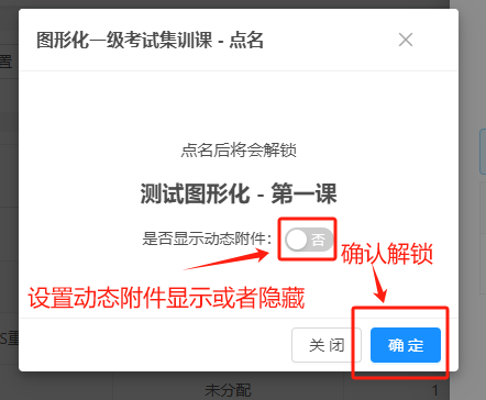 2、在专题课班级中,点击专题课可以解锁对应的专题课课次内容,你还可以设置是否显示动态附件来控制学生平台显示跟隐藏某些课件。