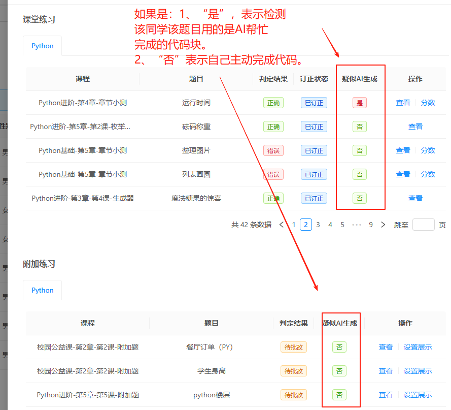 8、课堂练习、附加练习还有疑似AI生成做成判定功能: