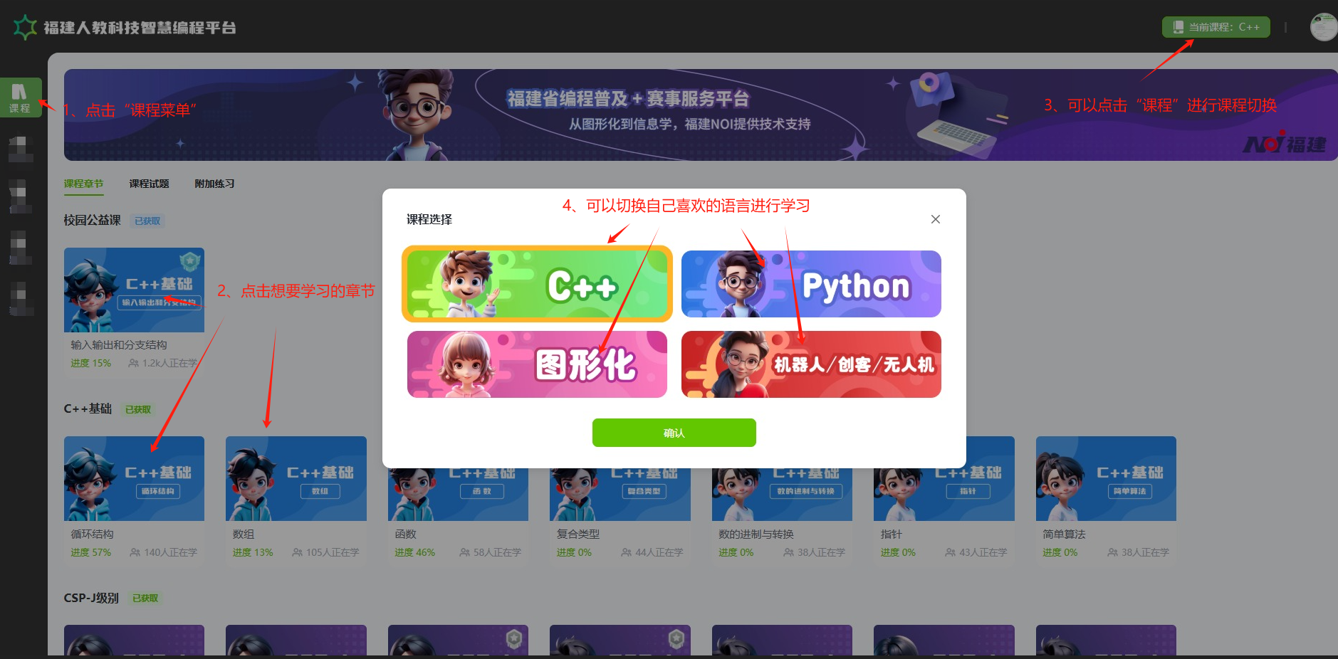 进入平台后,在课程页面,你可以看到丰富多样的课程。若你是编程初学者,可选择 “C++ 基础” 课程,从输入输出和分支结构等基础内容学起;若你对 Python 感兴趣,也能找到对应的 Python 课程;还有图形化编程、机器人 / 创客 / 无人机等课程供你挑选。