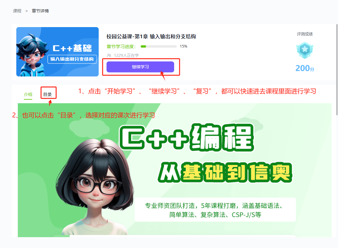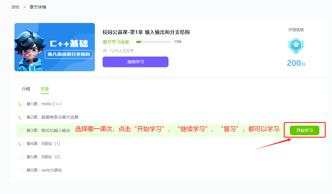 点击你感兴趣的课程,比如 “C++ 基础 - 输入输出和分支结构” 课程,进入课程详情页面。这里会显示章节学习进度,你能清晰了解自己的学习情况,还能看到有多少人正在学习这门课程。 点击 “开始学习”、“继续学习”、“复习” 按钮,你可以看到课程的介绍,了解这门课程是由专业师资团队打造,经过多年打磨,涵盖基础语法、简单算法等内容。 切换到 “目录” 标签页,你可以看到课程的具体章节课次安排,像 “Hello C++”“数据类型与算术运算” 等课程内容。点击 “开始学习”、“继续学习”、“复习” 按钮,即可进入课程学习界面。