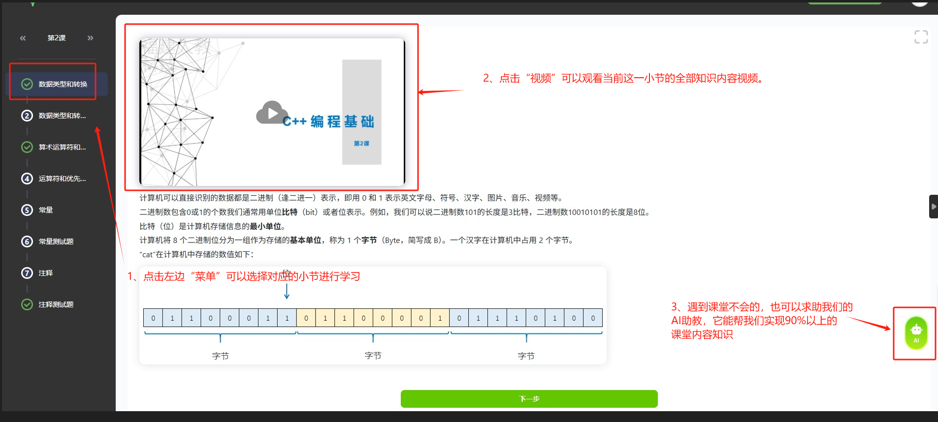在课程学习界面,左侧是课程的章节列表,每完成一个章节的学习,会有相应的标记。中间区域是课程的详细内容,可能是视频讲解,也可能是图文教程。比如在 “数据类型和转换” 章节,会详细讲解计算机数据存储的相关知识,帮助你理解编程中的数据概念。