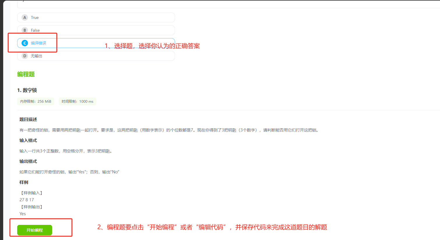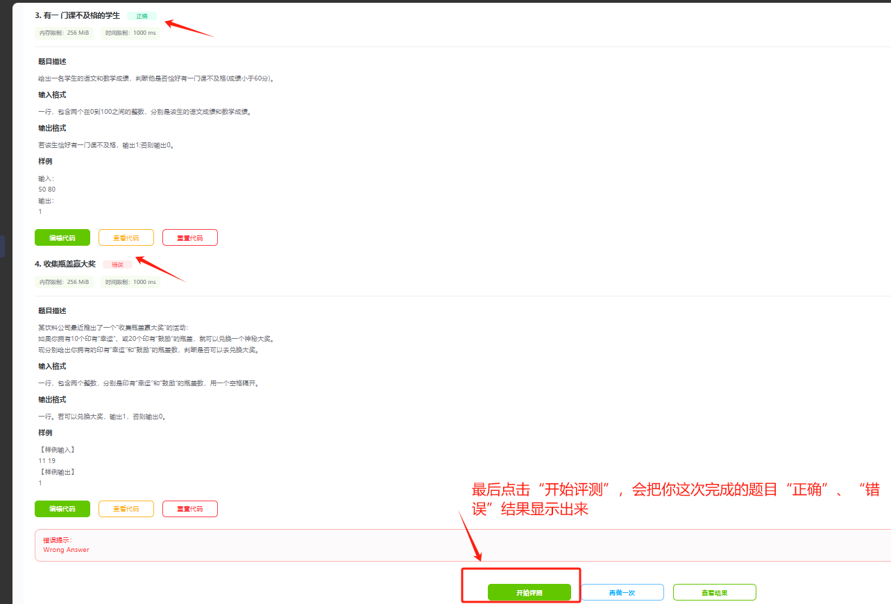 学完一个小节或者一个章节后,会有对应的小节测试题和章节小测来检验你的学习成果。这些测试题形式多样,可能是选择题,也可能是编程题。你需要根据所学知识进行作答,完成后点击 “开始评测” 按钮,系统会对你的答案进行评判,帮助你了解自己对知识的掌握程度。