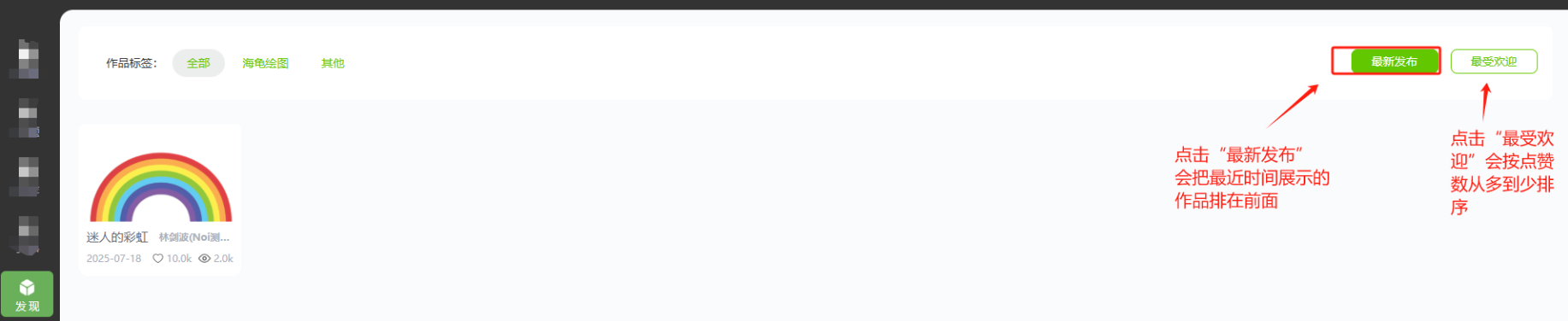 在 “发现” 页面,你可以通过作品标签和排序方式对作品进行筛选。
