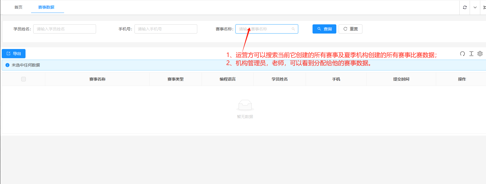 设置筛选条件:在页面顶部,填写 学员姓名、手机号,选择 赛事名称(运营方可见自身创建及机构赛事;机构管理员 / 老师仅显示分配给自己的赛事)。
