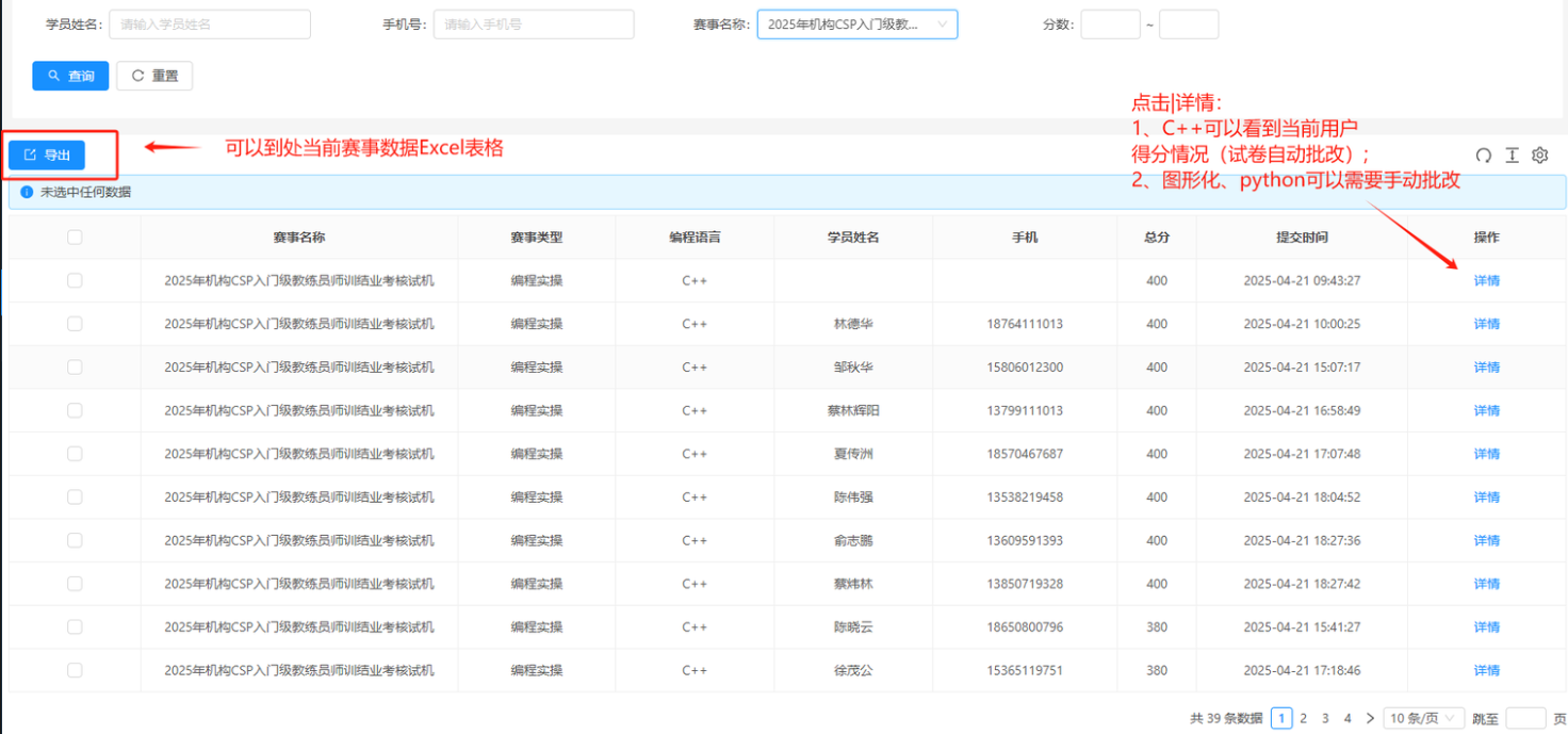 点击左上角 「导出」 按钮,可将当前赛事的 学员得分、提交时间 等数据保存为 Excel 表格,方便统计。