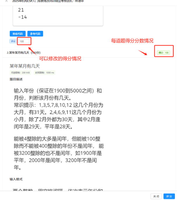 C++ 赛事:系统自动批改,直接查看选手得分。如果有错误可以直接修改评分框分数,然后点击“评分”。