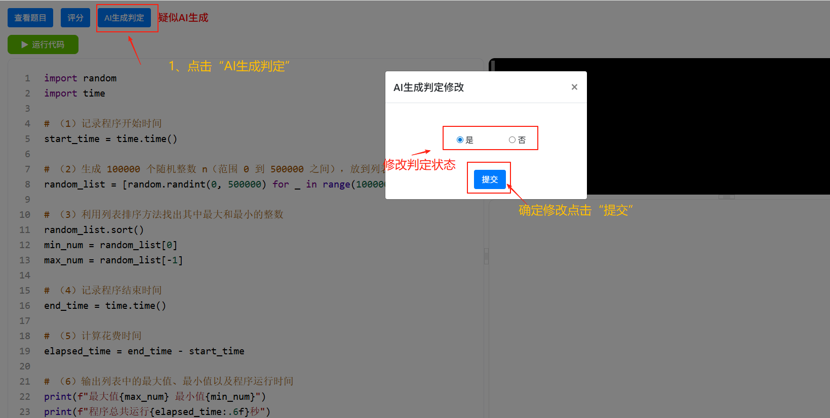 如果AI判定错了,有疑义的可以点击“查看代码”,然后点击“AI生成判定”进行修改。
