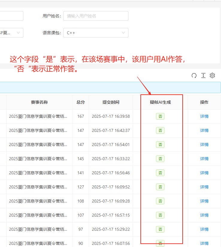 在赛事数据列表中,如果在疑似AI生成这一列中有“是”这个标记,说明该用户这场赛事中某道题用AI来作答了,点击“详情”可以看到对应的哪一道题用AI生成,在评分的位置后面有个红色的标记“疑似AI生成”。
