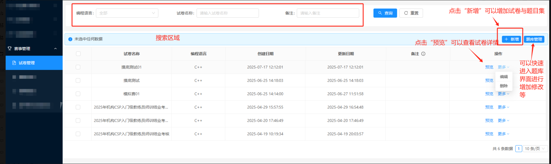 在试卷管理页面,你可以通过编程语言、试卷名称、备注等条件进行搜索。选择相应的编程语言,输入试卷名称或备注后,点击 “查询” 按钮,系统将快速筛选出符合条件的试卷,方便查找。