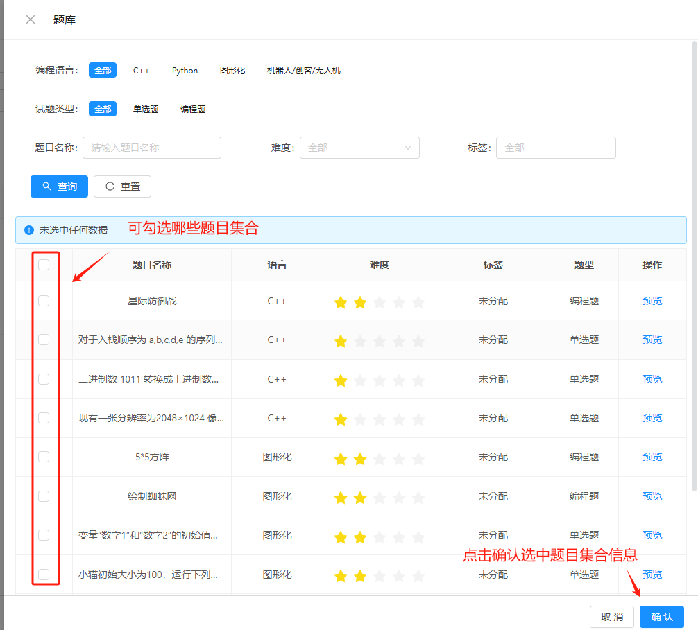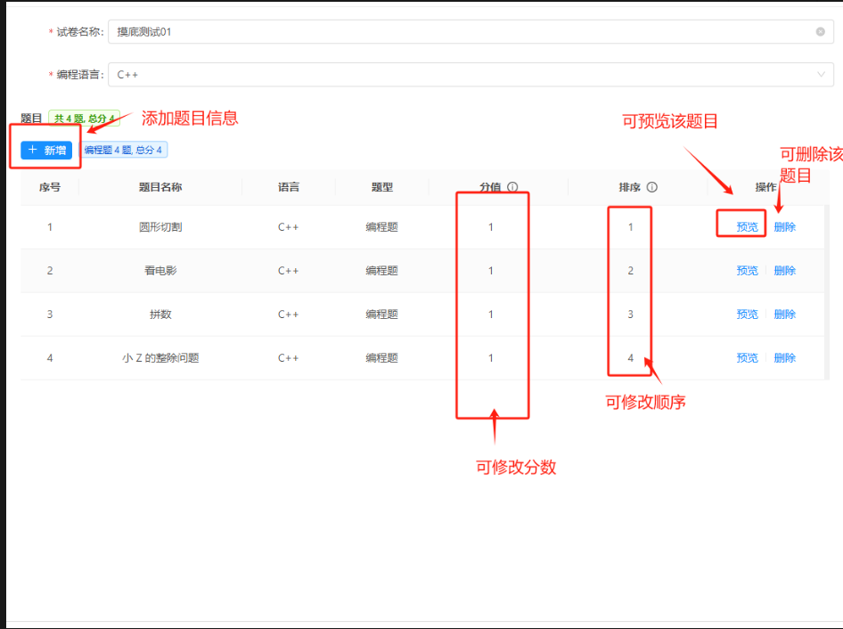 点击页面右侧的 “新增” 按钮,在弹出的新增试卷页面中,你需要输入试卷名称、选择编程语言、添加题目等信息。输入完成后,点击 “确认” 按钮,即可完成新试卷的创建。