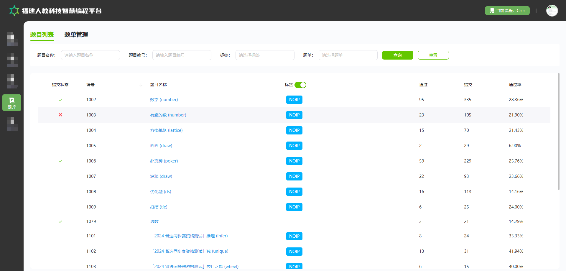 进入平台后,点击左侧 “题库” 按钮,进入题库页面。在题目列表中,你可以通过题目名称、题目编号、标签、题单等条件进行筛选,找到你需要的题目。