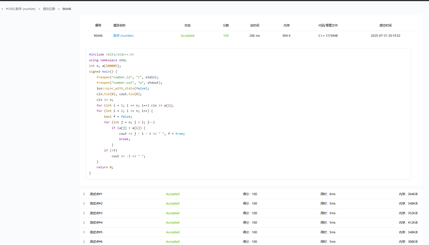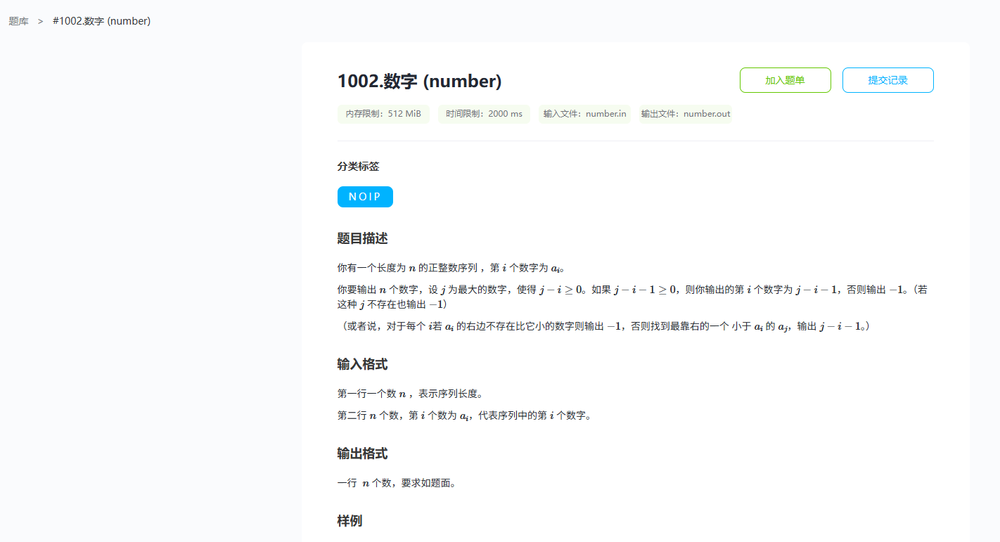 点击你感兴趣的题目,比如 “1002. 数字 (number)”,进入题目详情页面。这里会显示题目描述、输入格式、输出格式、样例等内容,帮助你理解题目要求。