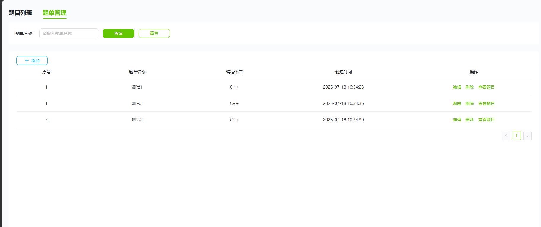 在题单管理页面,点击 “添加” 按钮,你可以创建一个新的题单。输入题单名称,选择编程语言,然后点击 “确认” 按钮,即可创建一个新的题单。 (二)题单查询