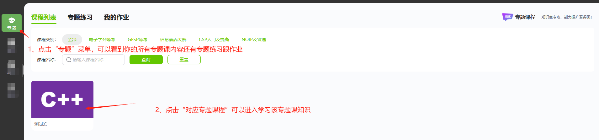 进入平台后,点击左侧 “专题” 按钮,进入专题课程页面。在课程列表中,你可以看到不同类型的专题课程,比如 “xxxx专题课”“xxxx专题课” 等。你可以根据自己的需求和学习目标选择相应的课程。