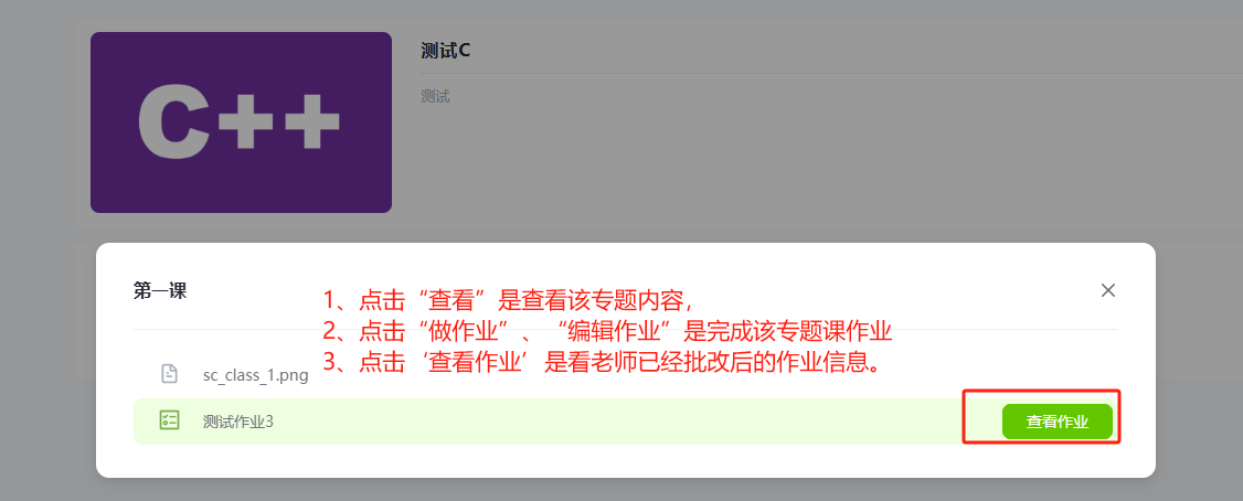 在课程学习界面,会弹出该专题课课程相关资料及作业的窗口,你可以点击 “查看” 按钮,查看这些资料,辅助你进行课程学习和点击“做作业”按钮,完成该专题课的作业。