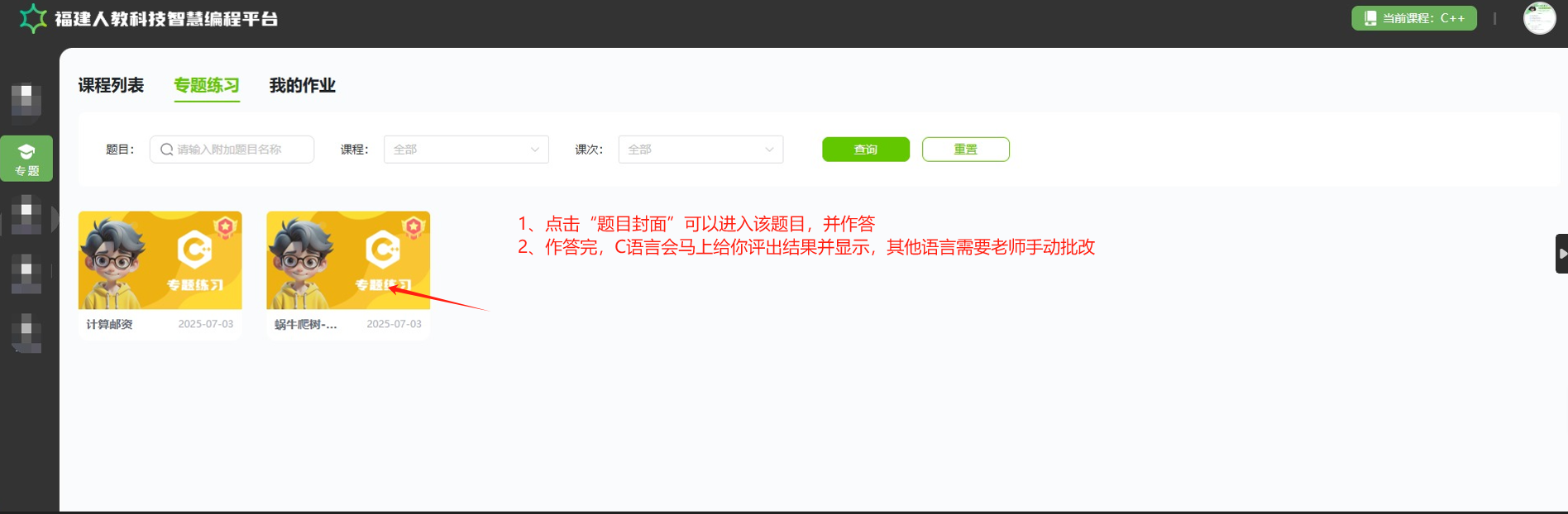 在专题课程页面,点击 “专题练习” 标签页,你可以看到老师发给我们的专题练习题目。完成这些题目,有助于你巩固所学知识。你可以根据题目名称、课程、课次等条件进行查询,找到适合自己的练习题目进行练习。